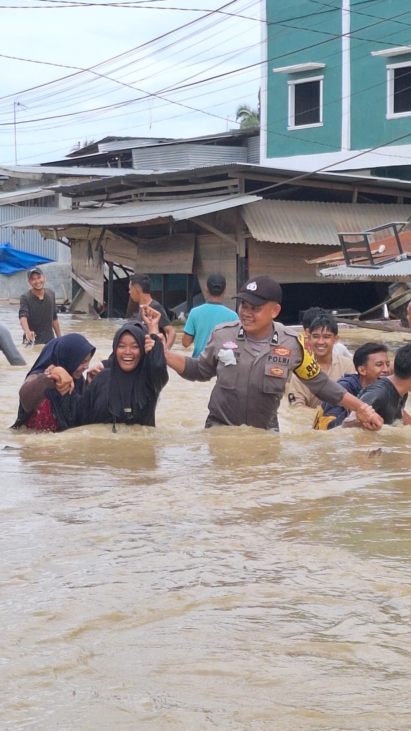 Personel Polsek Seruway juga terlihat sigap membantu warga untuk mengungsi dan menyelamatkan harta bendanya.