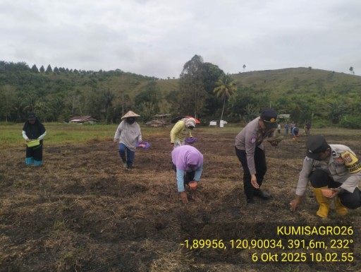 Pamona Timur, JURNALPOLRI.MY.ID — Langit pagi di Desa Olumokunde, Kecamatan Pamona Timur, Kabupaten Poso, tampak tenang ketika deretan petani, aparat desa, dan polisi bahu-membahu menanam benih jagung di lahan subur seluas 1,6 hektare, Senin (6/10/2025).