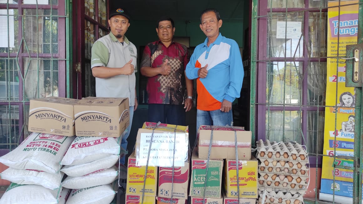 Rumah warga dan barang-barang dagangan disapu banjir hingga mengakibatkan kerugian yang sangat Besar, selain kerugian material beberapa desa terimbas dan terisolir karena genangan banjir yang melanda hampir seluruh kampung yang berada di Kec. Seruway,Kab.Aceh Tamiang,yang diserahkan langsung oleh Manager Perusahaan, PT Mora Niaga Jaya kepeda Camat Seruway melalui Kasie Pelayanan Selamat,SE.