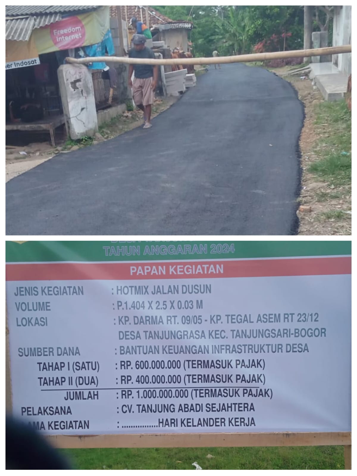 Bogor, jp Pemerintah Desa Tanjungrasa,Kecamatan Tanjungsari, Kabupaten Bogor, merealisasikan program Bantuan Keuangan (Bankeu) Satu Miliar Satu Desa atau Samisade dari Pemerintah Kabupaten Bogor tahun 2024 Tahap I dengan membangun Jalan Desa berupa Hotmix dengan panjang. Volume P. 1.404 X2.5 X 0.03 M Yang berlokasi di Kp. Darma RT 09 RW 05. Menghubungkan ke Kp. Tegal asem RT 23 RW 12 Desa Tanjungrasa, Kecamatan Tanjungsari, Kabupaten Bogor.