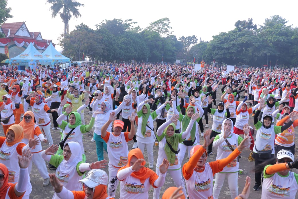 KAB. BANDUNG – Jurnalpolri.com, Ribuan warga terlihat antusias saat mengikuti giat senam aerobik keluarga “Segar Dingin SD C-1000 Aksi Segar Massal Bodyguard Tubuh Biar Gak Ngedrop” di Plaza Lapangan Upakarti Komplek Pemkab Bandung, Soreang, Kabupaten Bandung, Minggu (11/8/2024) pagi.