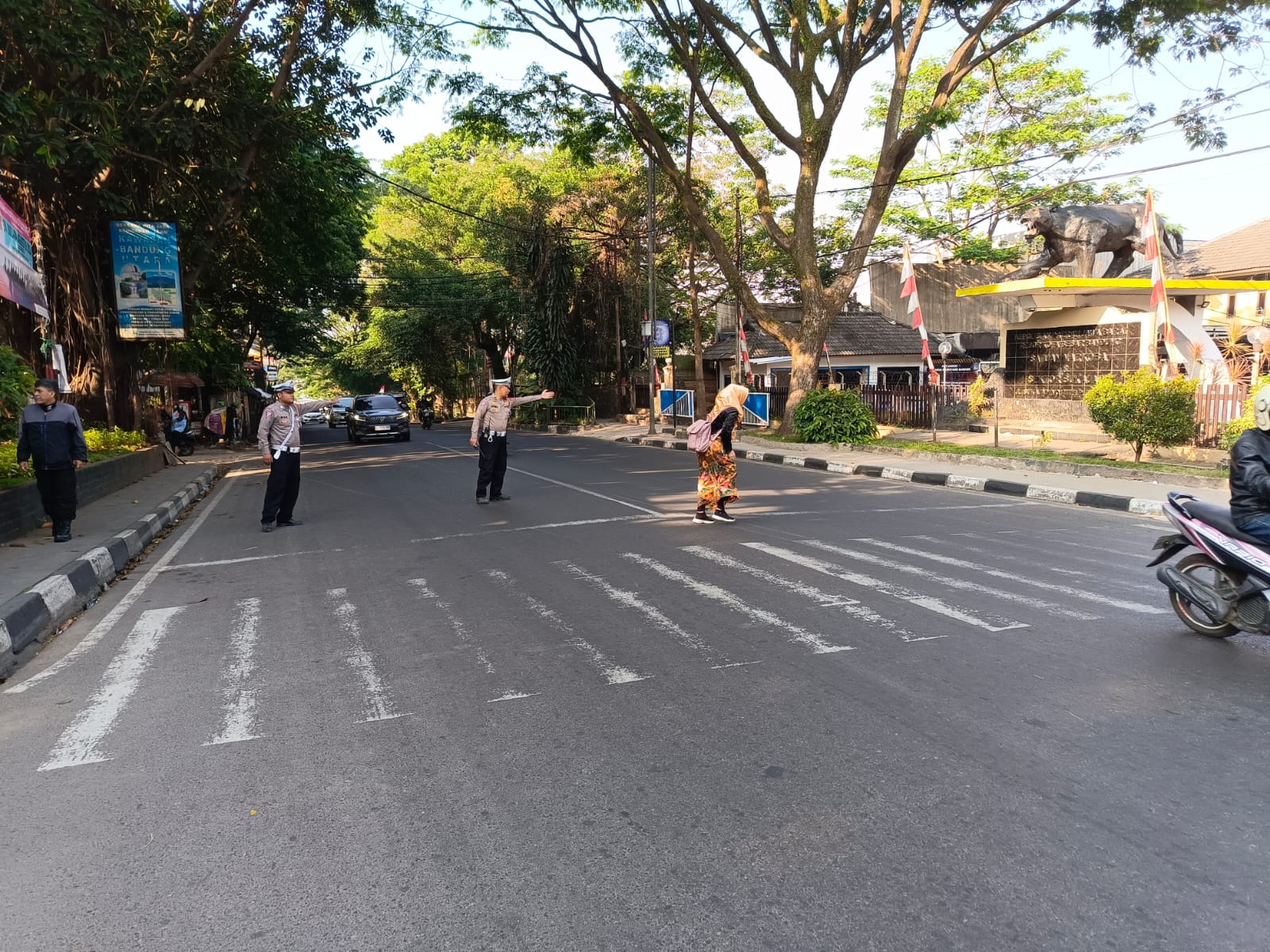 Rutinitas Gatur Lalin Sore, Polsek Sukajadi Bantu Menyeberangkan Masyarakat