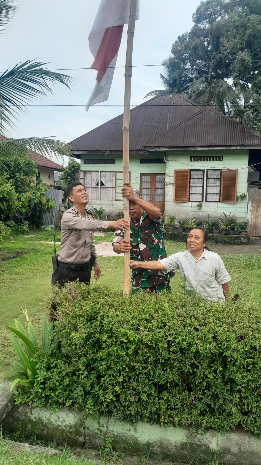 Jurnalpolri.com – PEMATANG SIANTAR-SUMATERA UTARA. Dalam menyemarakkan dan memeriahkan HUT Kemerdekaan RI yang ke-79, Bhabinkamtibmas Kelurahan Toba Aipda Eko Silalahi ,SH bersama Babinsa Serka J. Situmorang Kompak Memasangkan bendera merah putih di depan rumah Warga Desa Binaannya