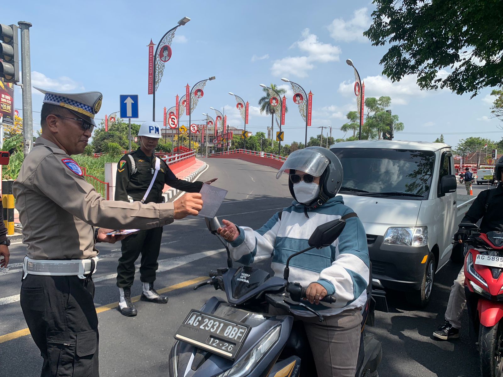 Selain memberikan imbauan secara langsung, mereka juga membagikan brosur bertuliskan untuk tertib berlalu lintas, dengan memakai helm, tidak melawan arus dan tidak berboncengan lebih dari satu.