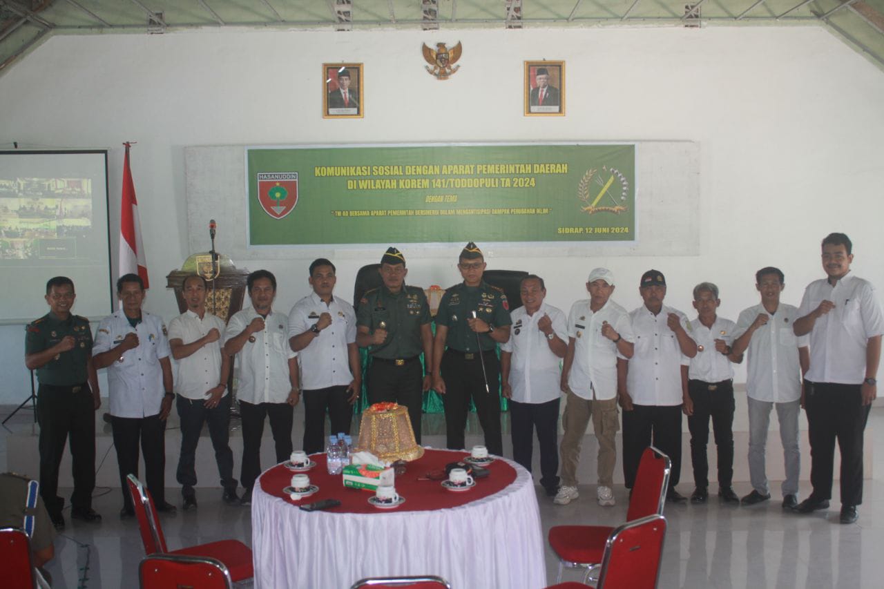 JURNALPOLRI.MY.ID, Sidrap – Kepala Staf Korem 141/Toddopuli Kolonel Arm Tejo Widhuro, S.Sos., M.Si., membuka kegiatan Komunikasi Sosial (Komsos) dengan Aparat Pemerintah Daerah di Wilayah Korem 141/Toddopuli, bertempat di Aula Makodim 1420/Sidrap, Kabupaten Sidenreng Rappang, pada Rabu (12/06/2025). Kegiatan ini bertujuan memperkuat sinergi antara TNI dan pemerintah daerah dalam menghadapi dampak perubahan iklim.