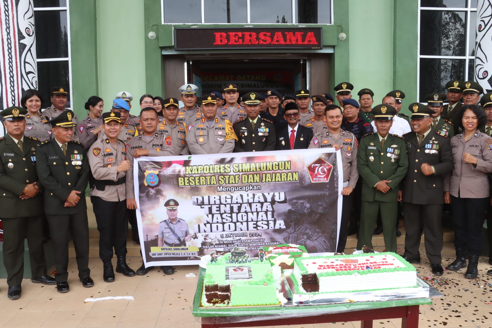 JURNALPOLRI.COM- Simalungun, Sumatera Utara – Sinergitas antara Tentara Nasional Indonesia (TNI) dan Kepolisian Republik Indonesia (Polri) kembali diperlihatkan dalam peringatan Hari Ulang Tahun (HUT) ke-79 TNI yang dilaksanakan di Kabupaten Simalungun pada Sabtu, 5 Oktober 2024. Sebagai bentuk apresiasi atas peran TNI dalam menjaga keutuhan negara, Kapolres Simalungun, AKBP Choky Sentosa Meliala, memberikan kejutan berupa kue ulang tahun kepada Komandan Kodim 0207/SML, Letkol Inf Slamet Fadjan, M.Han.