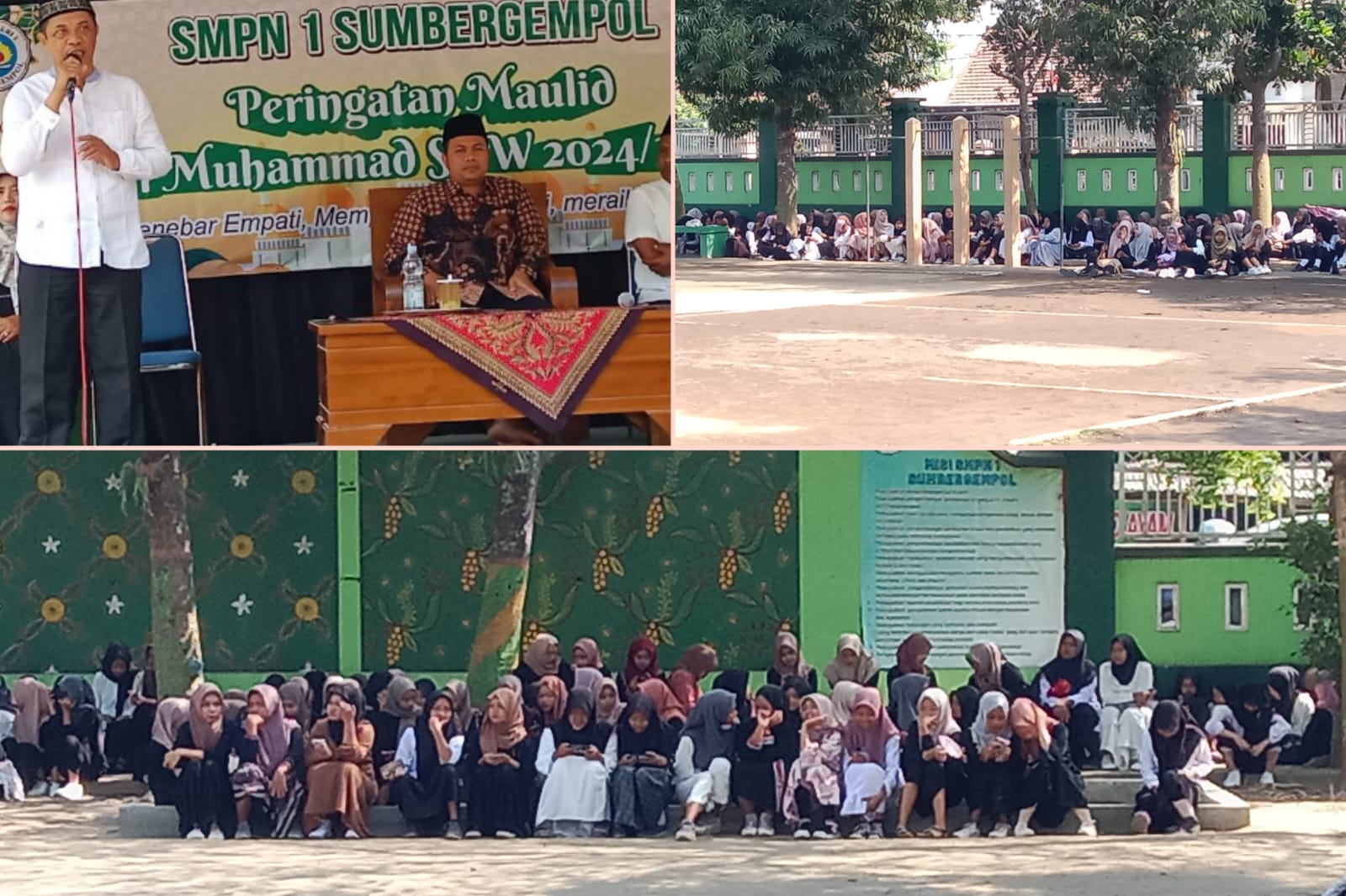 SMPN 1 Sumbergempol, Tulungagung, menggelar peringatan Maulid Nabi Muhammad SAW dengan penuh khidmat. Acara yang berlangsung di halaman sekolah, Rabu, (18/9/2024).dihadiri oleh seluruh siswa, guru, dan staf sekolah. Kepala Sekolah dan tamu undangan lainnya
