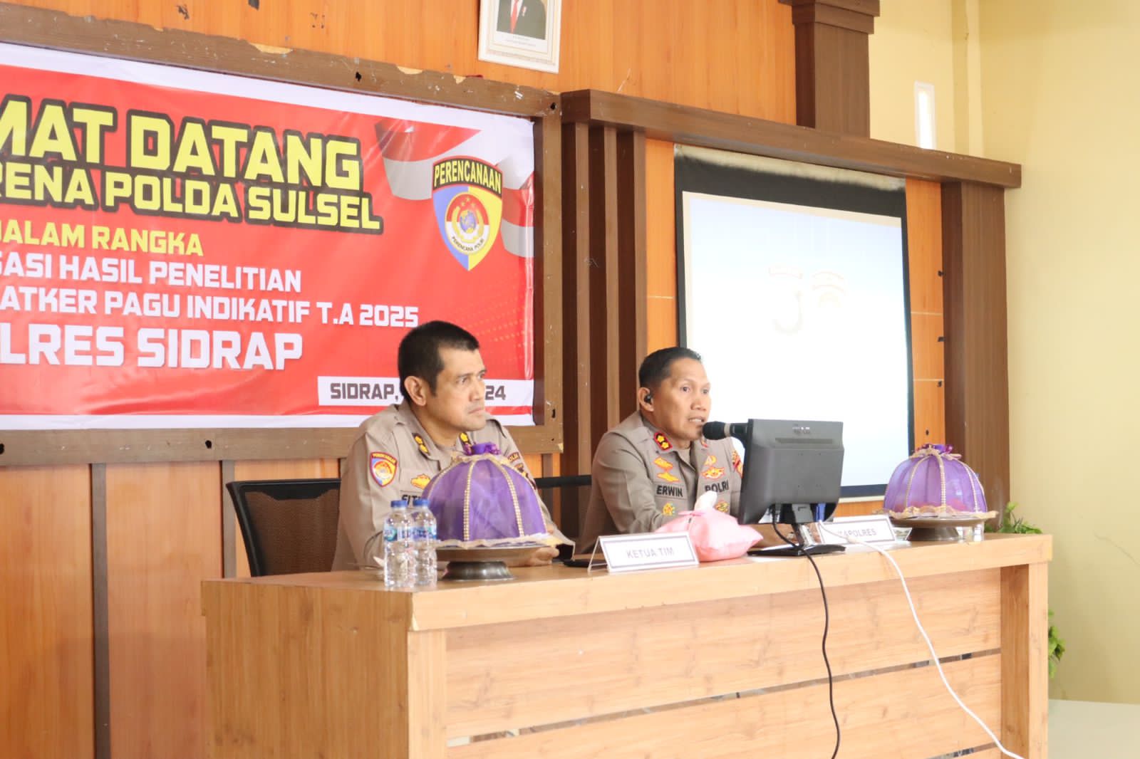 JURNALPOLRI.MY.ID, Sidrap – Kapolres Sidrap AKBP Erwin Syah, S.H., M.H., menyambut hangat kedatangan Tim Biro Rena Polda Sulsel yang dipimpin oleh AKBP Mohammad Fithrah Saleh, S.I.K, untuk melaksanakan sosialisasi hasil penelitian rancangan Rencana Kerja dan Anggaran (RKA) satker pagu indikatif tahun 2025.