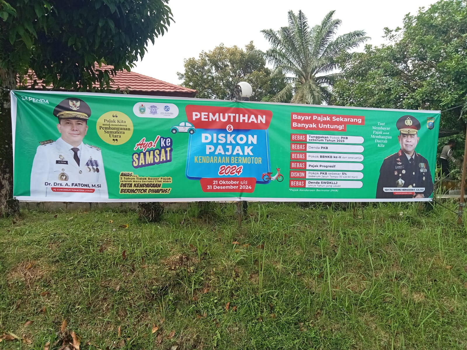 JP, PEMATANG SIANTAR-SUMATERA UTARA. Polres Pematangsiantar melalui Satuan Polisi Lalulintas (Satlantas) dan seluruh Polsek jajaran melakukan Sosialisasi tentang pemutihan pajak kendaraan bermotor dengan cara pemasangan spanduk di Wilayah Hukum (Wilkum) Polres Pematangsiantar bekerja sama dengan Bapendasu melalui UPT Samsat, Jasa Raharja Kota Pematangsiantar