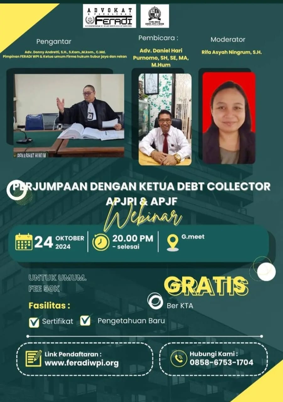 Dan dalam Google Meet nanti akan hadir pula Advokat Donny Andretti, S.H., S.Kom., M.Kom., C.Md., Pendiri dan Ketua Umum FERADI WPI & SUBUR JAYA LAWFIRM. Untuk Moderator pada tema yang spektakuler itu adalah KaDiv DPP FERADI WPI, Bu Rifa Asyah Ningrum, S.H., kemudian Event tersebut dibuka juga untuk peserta dari umum diluar anggota FERADI WPI SUBUR JAYA LAWFIRM.