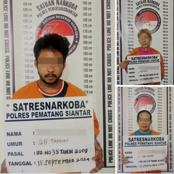 Kapolres Pematangsiantar AKBP Yogen Heroes Baruno SH, SIK melalui Kasat Resnarkoba AKP J.H Pasaribu SH, MH pada hari Selasa 17 September 2024 mengatakan ketiga pria itu berinisial DP alias N (46) warga Jalan Nagur Gg. Surapati Kelurahan Martoba Kecamatan Siantar Utara Kota Pematangsiantar, ES alias A alias WG (57) warga Jalan Cokro Gg. Tobing Kelurahan Melayu Kecamatan Utara Kota Pematangsiantar dan FB alias O (28) warga Jalan Angkola Kelurahan Martoba Kecamatan Siantar Utara Kota Pematangsiantar.
