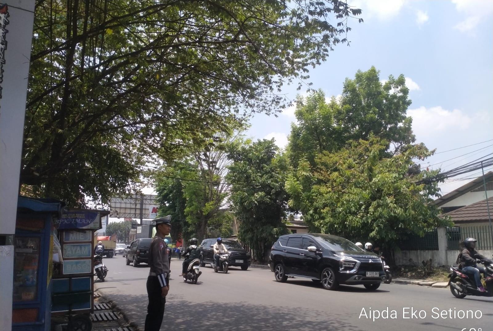 Antisipasi kemacetan siang hari, personil unit lantas Polsek Babakan Ciparay melaksanakan pengamanan jalur di titik rawan kemacetan Wilayah Hukum Polsek Babakan Ciparay Polrestabes Bandung.