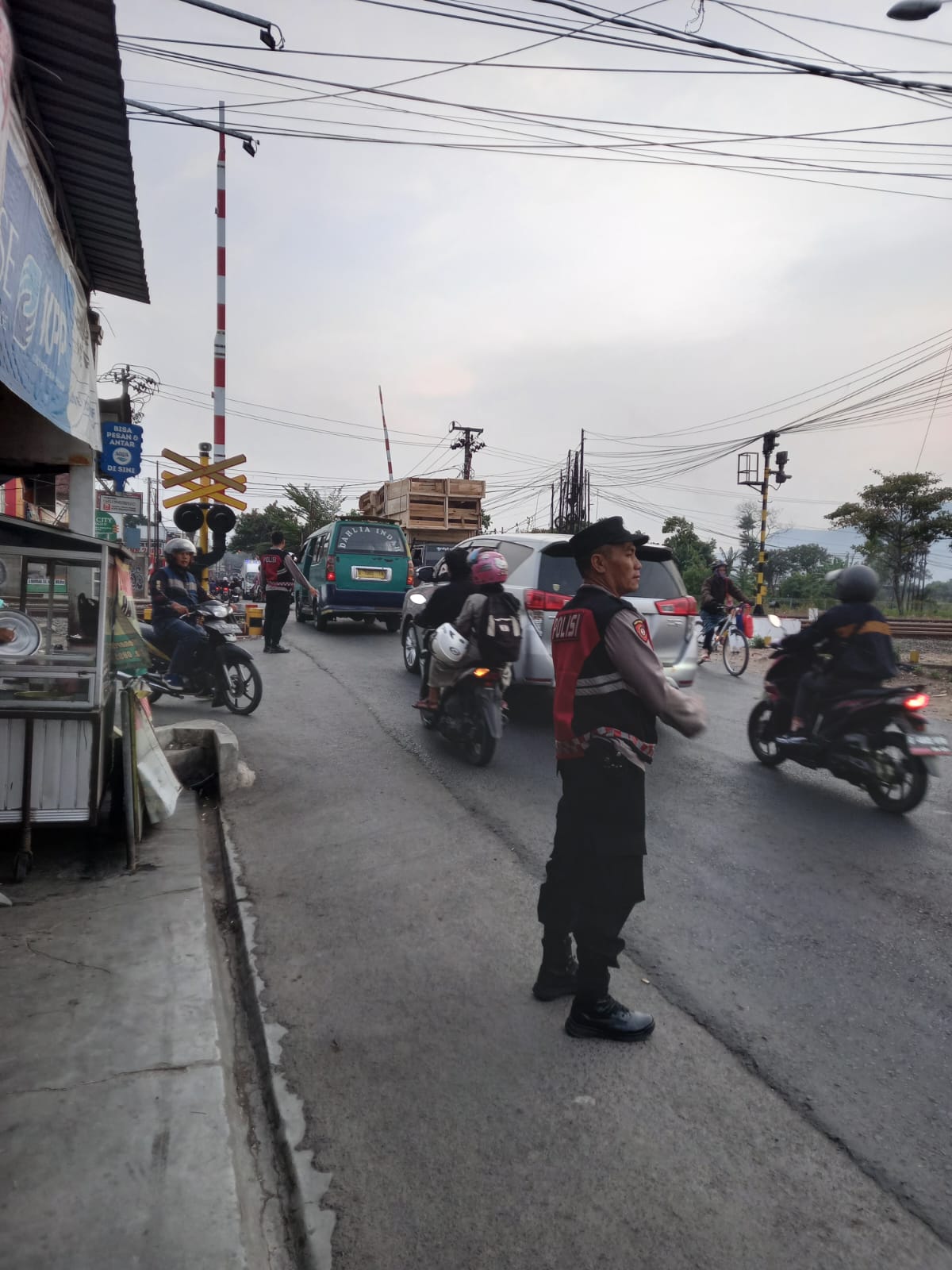 Personil unit samapta Polsek Rancaekek pelayanan pagi pengaturan lau lintas antisipasi kemacetan di sekitar perlintasan KA Rancaekek sebagai tindakan nyata dalam melayani, mengayomi dan melindungi masyarakat