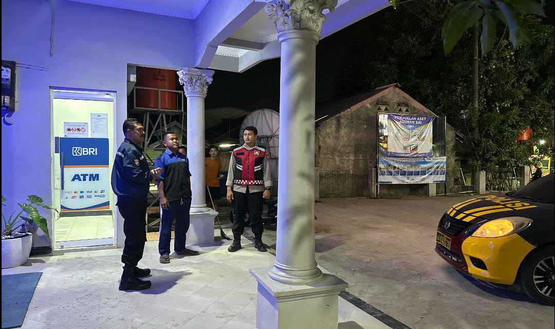 JP – Polres Karawang – Personel Polsek Telukjambe Barat Aiptu Agus Suryana, Bripka Dede Wahab dan Brigpol Indra Dwi Prasetyo menggelar patroli Perbankan, di Kantor Bank BRI Unit Wanakerta Desa Karangmulya, Telukjambe Barat, Karawang, Jawa Barat, Selasa (8/10/2024) dini hari.
