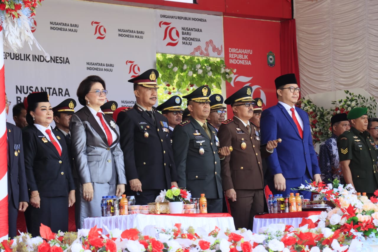 JP. Kapolres Poso AKBP Arthur Sameaputty, S.I.K., di Wakili Waka Polres Poso Kompol Anton H. Mohamad, SH, M.M. didampingi Ibu Wakil Ketua Bhayangkari Cabang Poso yang juga menjabat sebagai Sekda Kabupaten Poso Ny. Ir Heningsih Tampai MSi, menghadiri Upacara Bendera dalam rangka memperingati Hari Kemerdekaan Republik Indonesia ke-79 di Alun Alun Kota Poso. Sabtu (17/8/2024)