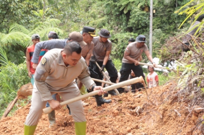 Selain meninjau dampak longsor, Kapolres Sidrap bersama rombongan juga ikut bergotong royong membantu warga membuka kembali akses jalan yang tertimbun tanah.