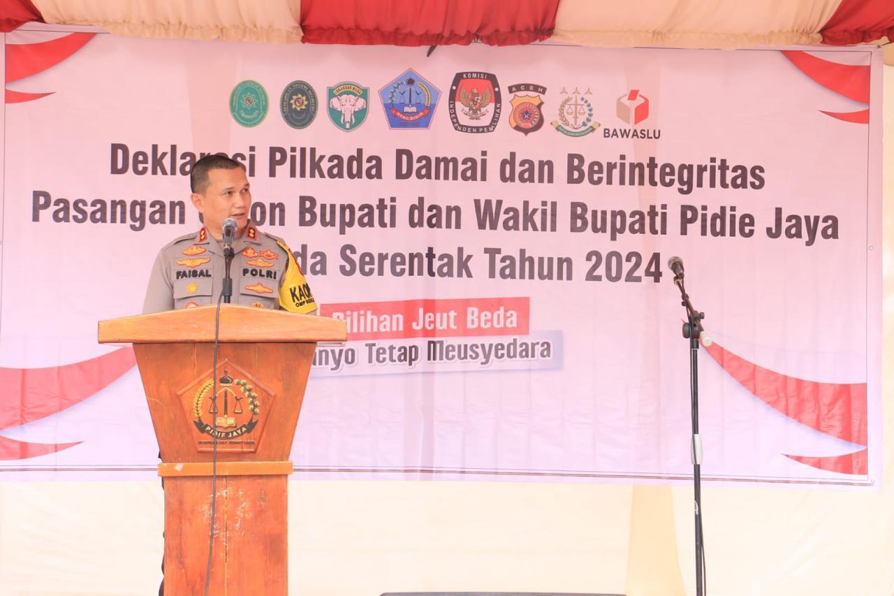 JURNAL POLRI.COM-PIDIE JAYA-ACEH-Kapolres Pidie Jaya, AKBP Ahmad Faisal Pasaribu, S.H., S.I.K., M.H., memimpin pengamanan Deklarasi Kampanye Damai untuk Pemilihan Kepala Daerah (Pilkada) Kabupaten Pidie Jaya 2024, yang berlangsung pada Kamis, 26 September 2024, di Lapangan Kantor Bupati Pidie Jaya.